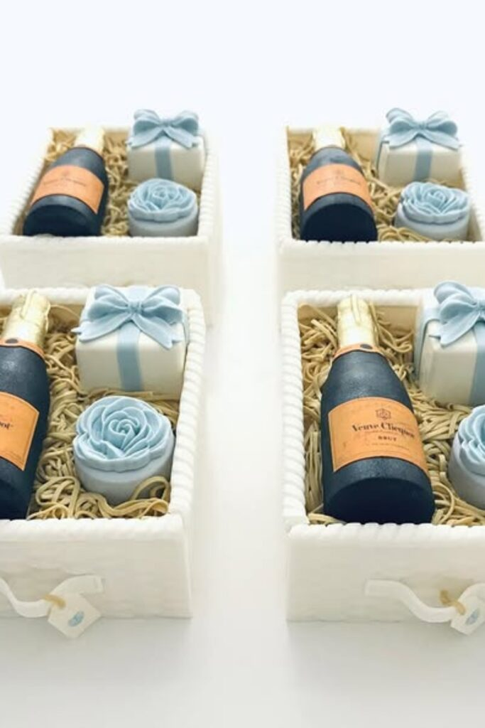 A small box with a mini bottle of champagne feels like a special reward. You can add a little extra gift inside the box.