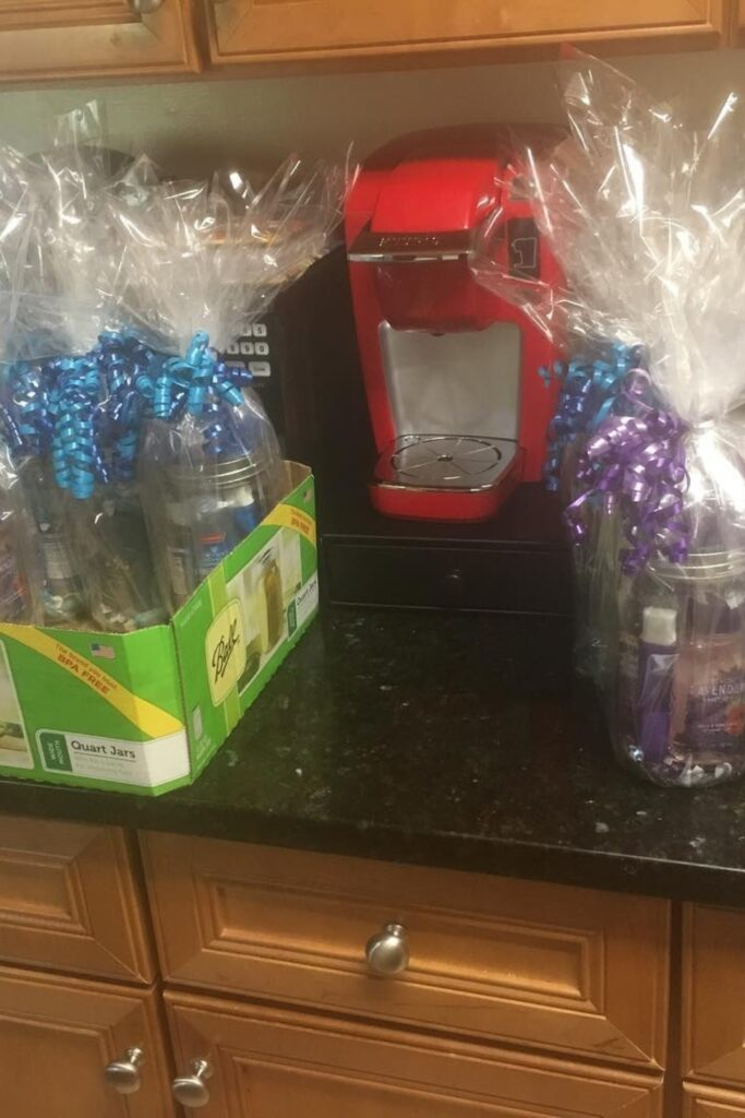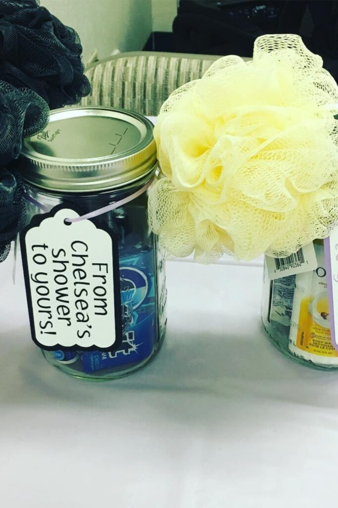 Fill a mason jar with things like bath salts or lotion. Wrap it in clear wrap and tie it with a ribbon.