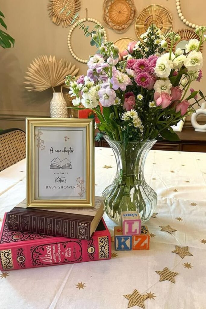This creates a charming and thoughtful display for your prizes. It works well for a baby shower with a literary theme.