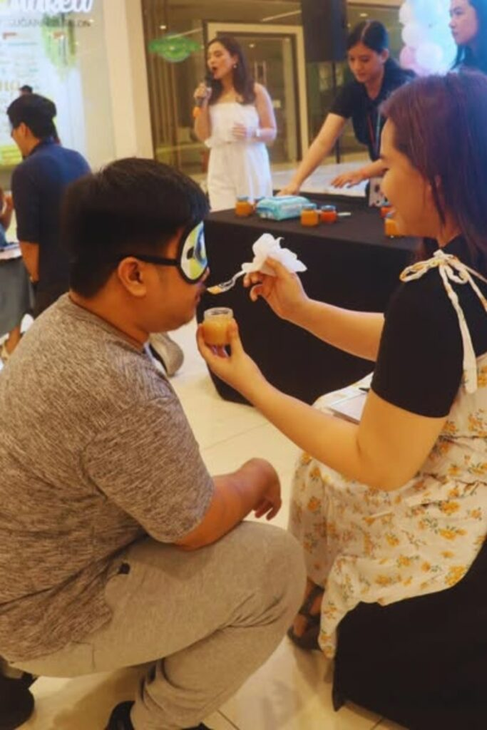 This is another version of the blindfold tasting game. It is messy and guarantees laughter.