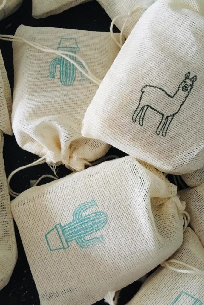 Fill small fabric bags with candy or tea bags. Pull the drawstring closed for a neat look.