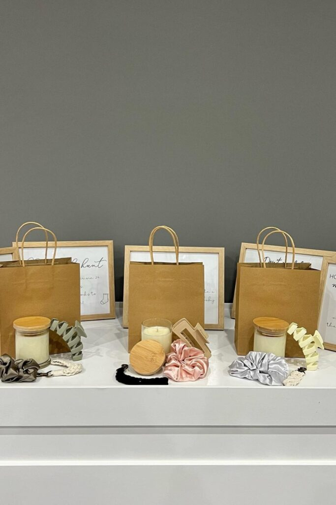 Use simple paper bags in neutral colors like white or beige. Fill them with items like candles or scrunchies.