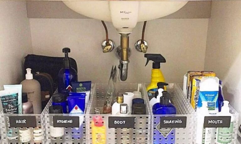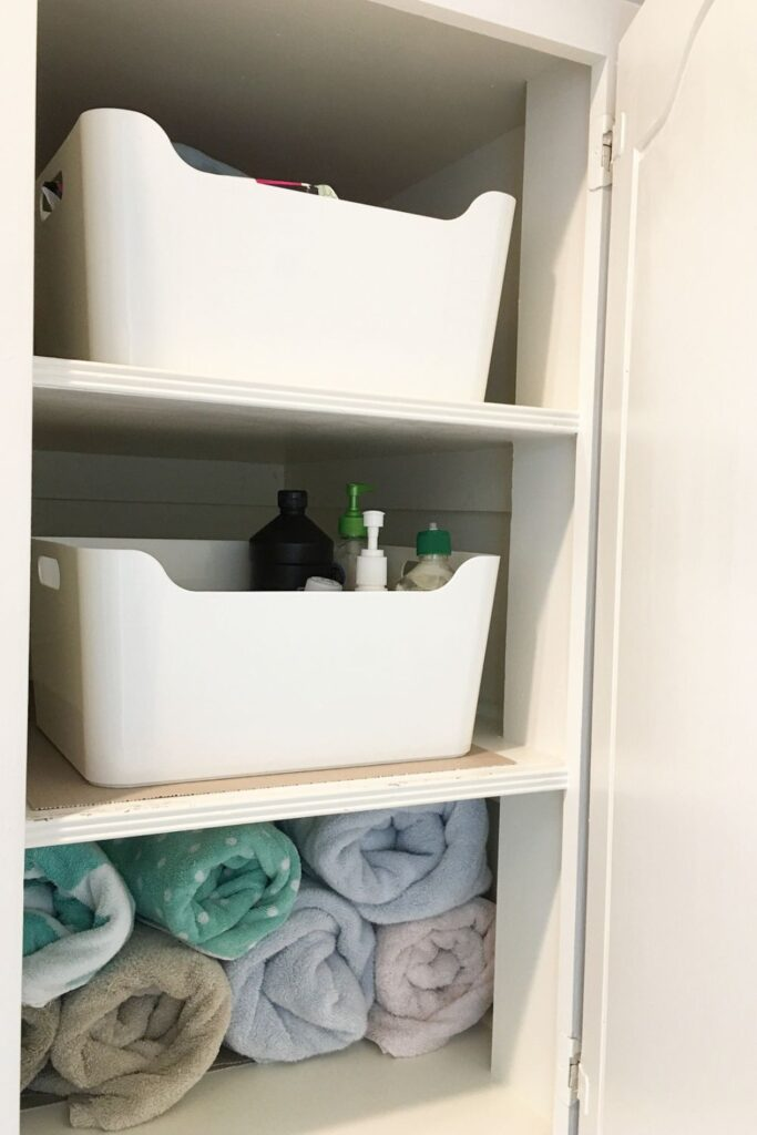 Declutter your counters by using large white bins inside your cabinets. Use them to store big items, extra bottles, or backup supplies. Add a stack of rolled towels to increase order and style. This creates a streamlined space that feels light and put together easily.