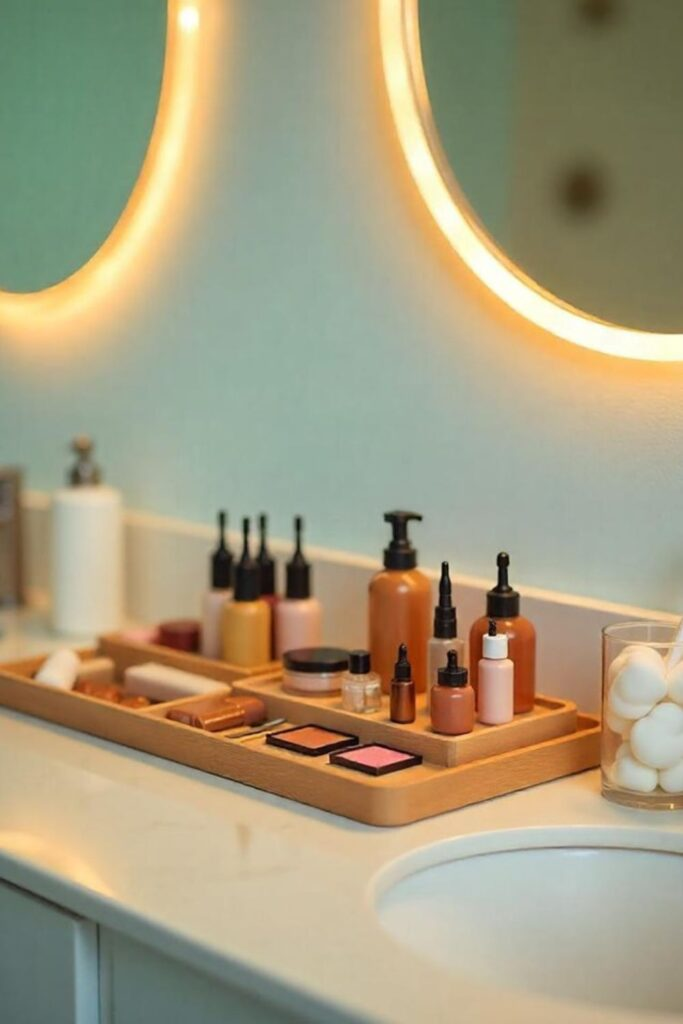 Improve your bathroom counter with a wooden vanity tray. It keeps serums, lotions, brushes, and powders together in one nice spot. The natural wood finish adds warmth. Putting items together on the tray keeps your counter tidy and makes your morning routine easy.