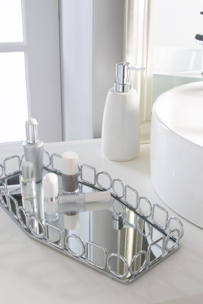 Choose a mirrored metal tray for a sleek, modern look. Its shiny surface adds instant glamour. The raised edges keep perfumes and skincare products in place. Pair this tray with chrome fixtures for an elegant, simple style. It is all about clean lines and reflection.