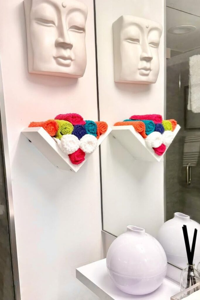 Make the most of a small bathroom with wall-mounted corner shelves. Display bright rolled towels and clear your counter space for daily essentials. These shelves add charm and keep towels dry and easy to reach. They are practical and look great.