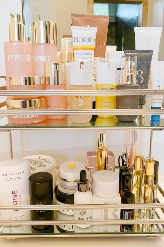 Keep your counter organized with a tiered metal shelf. This two-layer structure organizes skincare, makeup, and beauty items by height. It gives them a clean, structured look. It is perfect for beauty lovers who want vertical storage that shows their collection without making the space feel crowded.