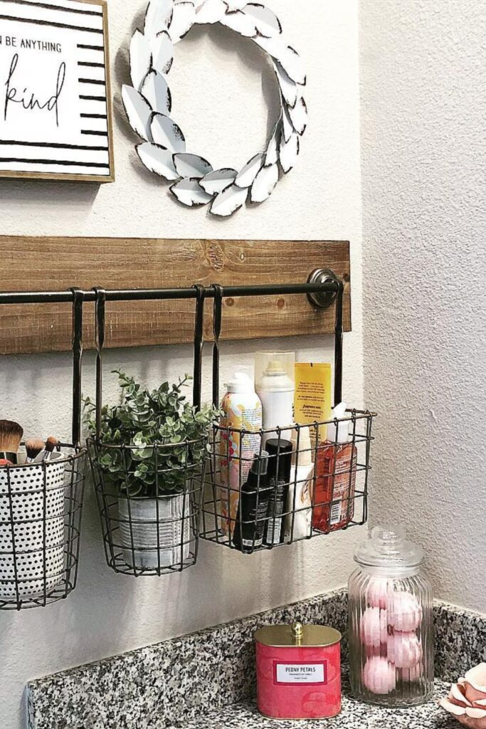 Add charm and efficiency with hanging wire baskets. Hang them from a strong rod. These baskets store brushes, lotions, plants, or sprays. This setup creates an industrial feel while freeing up counters and making essentials easy to reach. It is where style meets practicality.