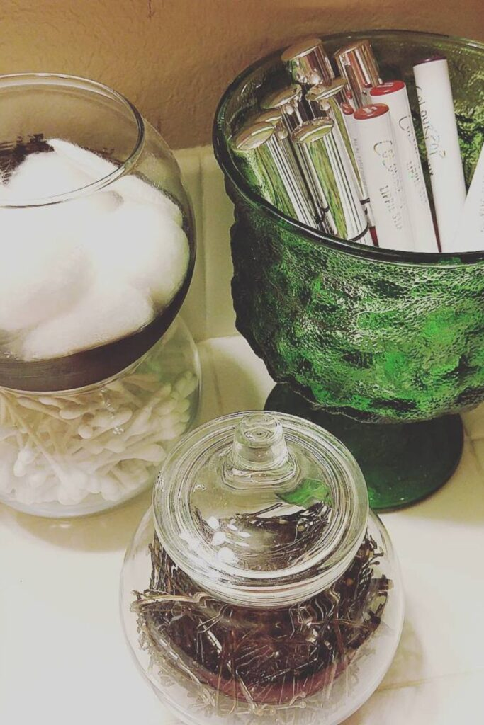 Improve your storage with decorative glass jars. Use them for cotton balls, Q-tips, or hairpins. This mixes function with style. Mixing clear and colored jars adds depth to your display. It offers an elegant, organized solution for bathroom counters.