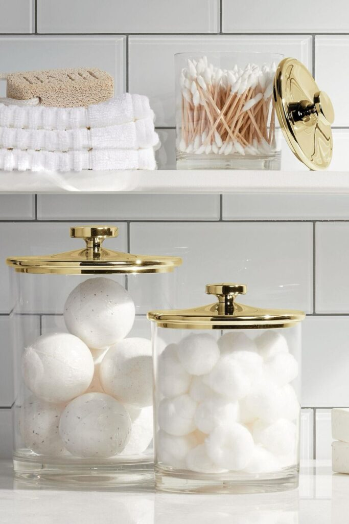 Add elegance with matching storage jars that have gold lids. Store bath bombs, Q-tips, and cotton balls while keeping them safe from dust. These jars improve both function and luxury. They create a matching look when paired with neatly folded towels.