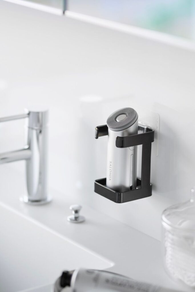 Keep grooming tools tidy with a mounted tool holder. Store electric shavers or facial brushes on the wall or mirror to free up counter space. This sleek holder makes tools easy to reach and keeps cords off surfaces. It supports organization and cleanliness in a modern bathroom.