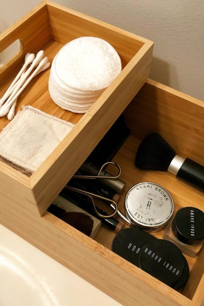 Upgrade your storage with a bamboo box organizer. It has sections for Q-tips, cotton pads, and makeup tools. This eco-friendly solution brings order to your essentials. Its natural wood finish adds warmth and charm, balancing function with style.