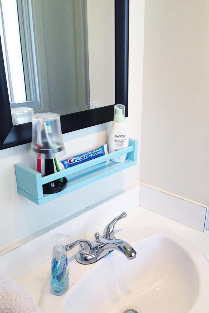 Put a compact wall shelf under the mirror for daily essentials like toothpaste and lotions. This smart addition frees up sink space while keeping everything close. Its thin build is perfect for small bathrooms. Its simple design adds a bit of personality to the space.