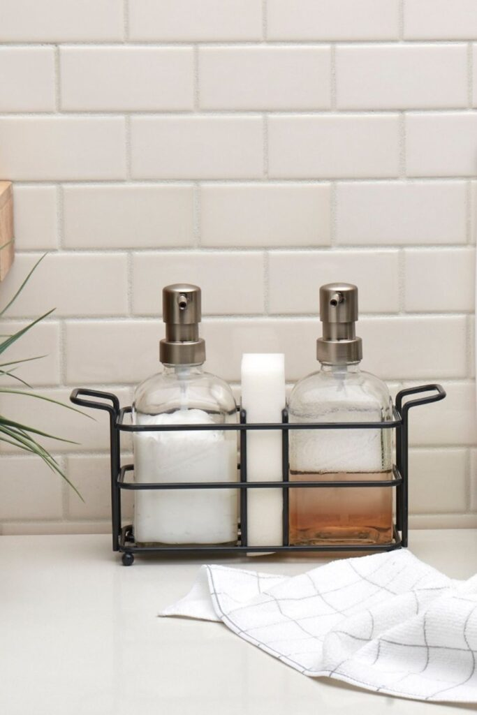 Add order with a counter bottle rack. Neatly arrange hand soaps and lotions in a wire design for a clean, industrial look. This simple organizer stops bottles from sliding or falling over. It gives the bathroom counter a polished, planned feel.