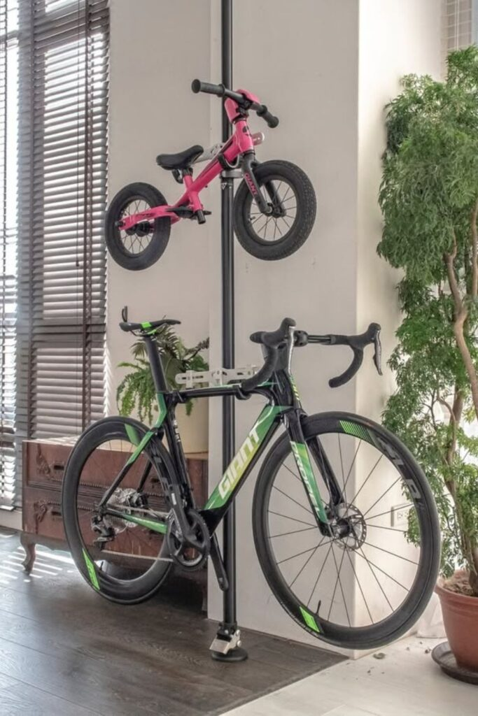 You can hang bikes at different heights on this pole.
