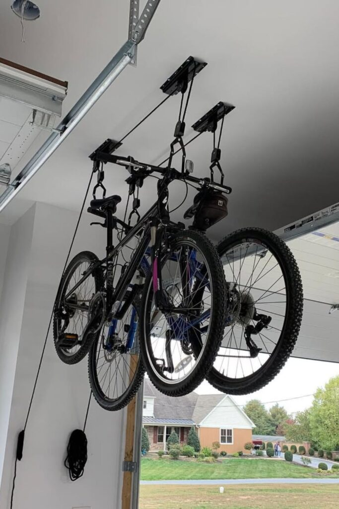 This system uses ropes and pulleys to hoist your bike up to the ceiling.