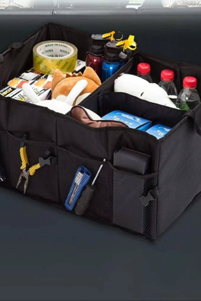 Trunks get messy when groceries, tools, and extras mix together. Use a divided trunk organizer to create separate zones for drinks, everyday supplies, and emergency items.