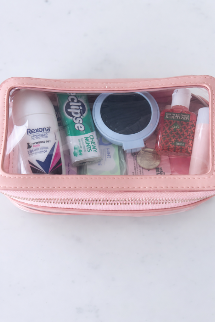 Small personal items can quickly get lost in doors and cup holders. A clear zip pouch keeps sanitizer, lip balm, and wipes together.