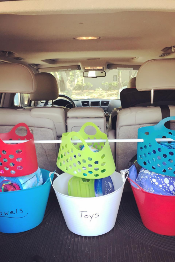 Family trips can get messy when items mix together. Labeled buckets split towels, toys, and extras into clear categories.