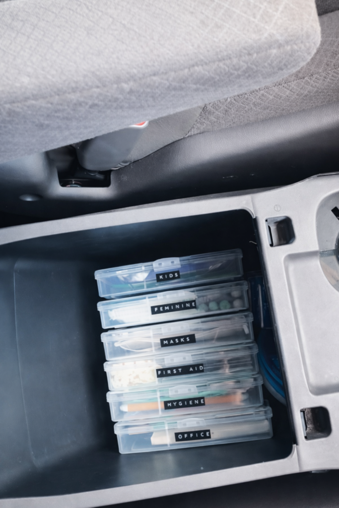 Place them on flat surfaces in the trunk or backseat corner. Use shallow drawers and labels for fast restocking.