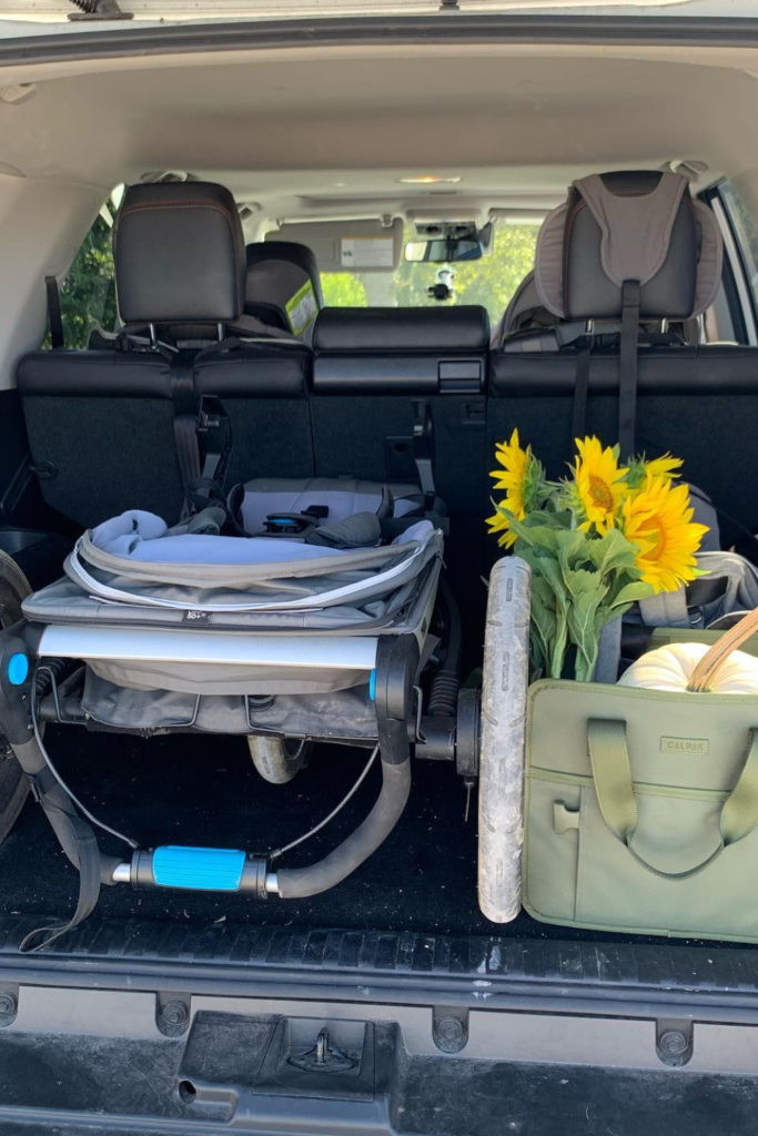 Large items like strollers and tote bags cause chaos if left unorganized. Assign a defined side of the trunk for each item.