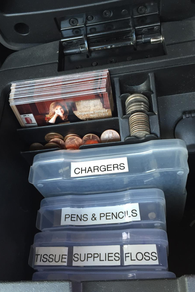 Glove boxes become useless when cluttered. Use small clear containers to separate coins, cables, and paperwork.
