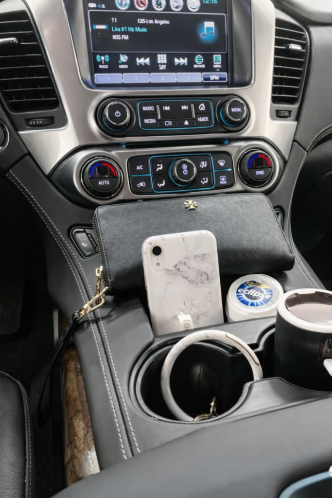 Cup holders lose value when everything competes for space. Assign one for drinks and others for cords, phones, or small pouches.