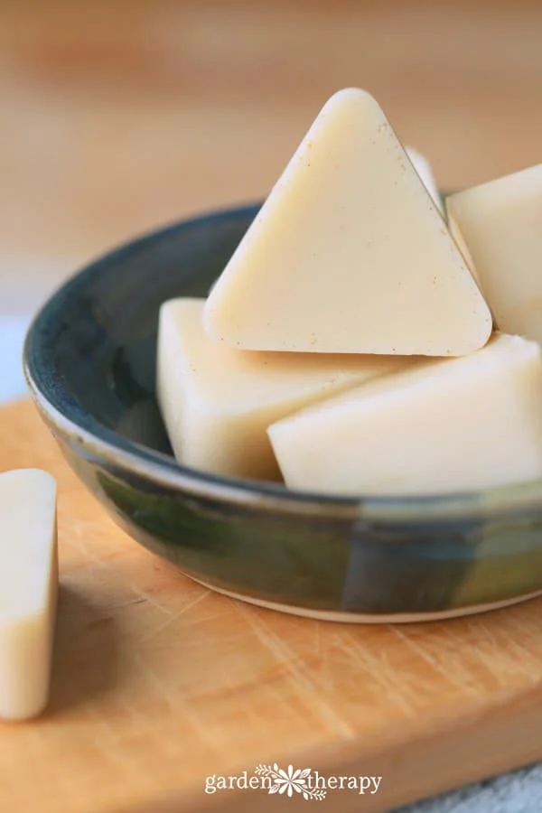 These are solid cubes of sugar scrub that smell like gingerbread. They are easy to make and very cute. They are a festive treat for the skin.