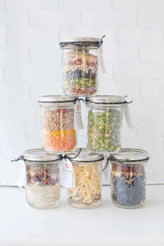 A single jar filled with the dry ingredients for a favorite soup. It is an easy, thoughtful, and practical gift. You can choose from many different soup recipes.