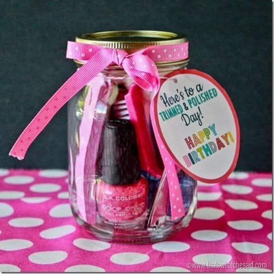 A jar containing nail polish, files, clippers, and hand cream. It is everything needed for a DIY manicure. It is a fun and practical present.