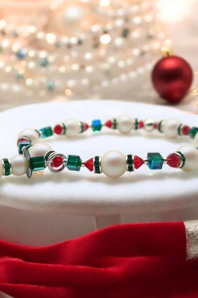 Use red, green, and pearl beads with elastic string to make a bracelet that fits most wrists.