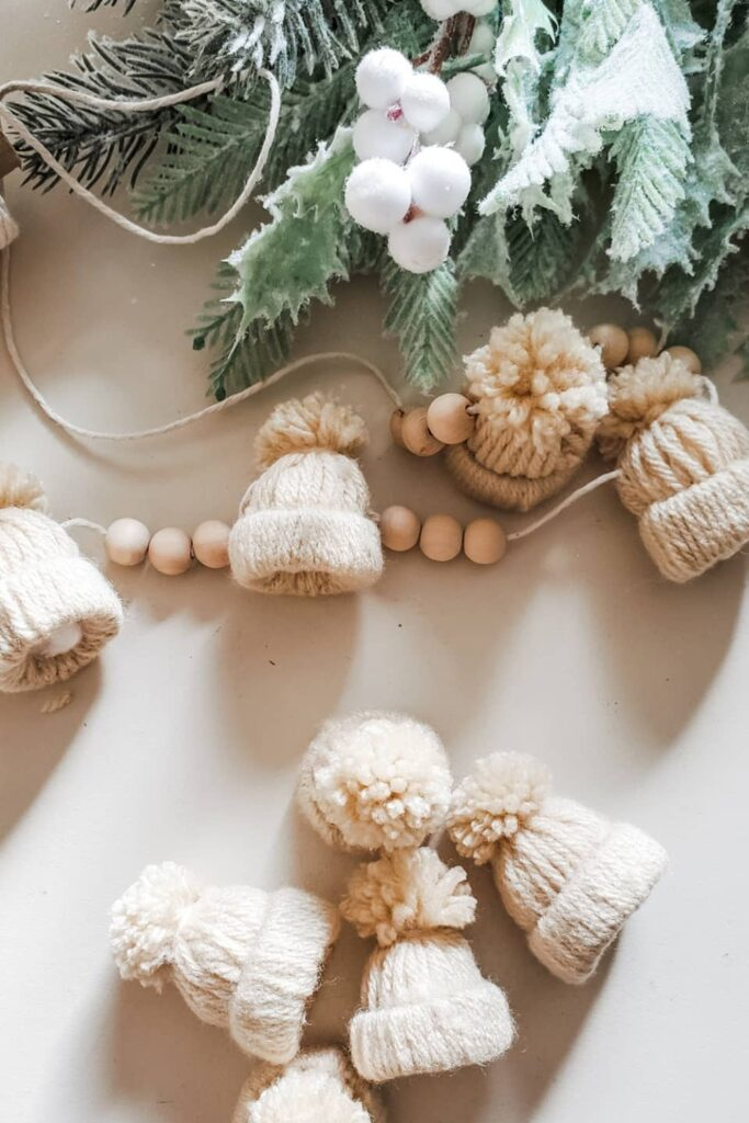 Use leftover yarn to make small hat ornaments with cardboard loops and pom-poms.