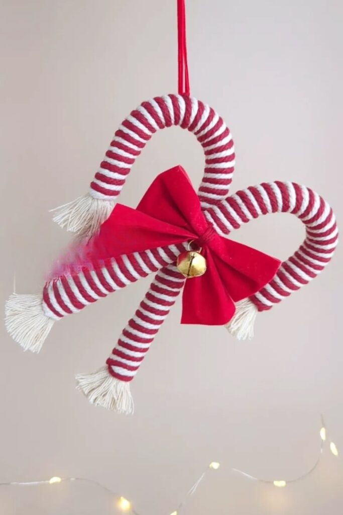 Shape thick rope into candy cane forms and wrap with red and white yarn.