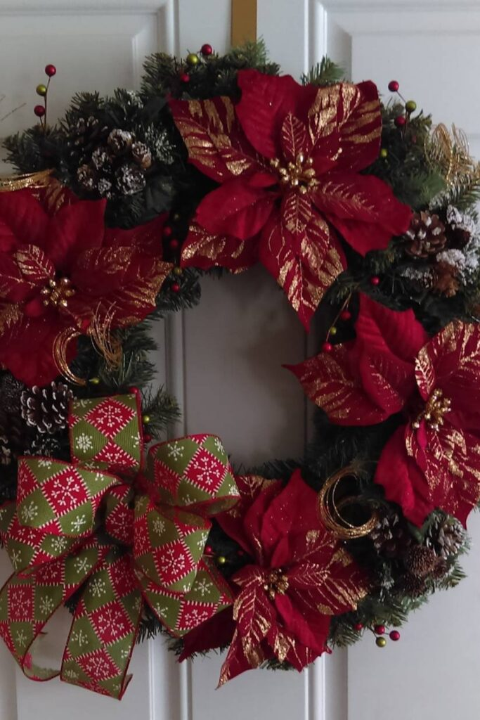 Attach poinsettias, pinecones, berries, and gold accents to an evergreen wreath.