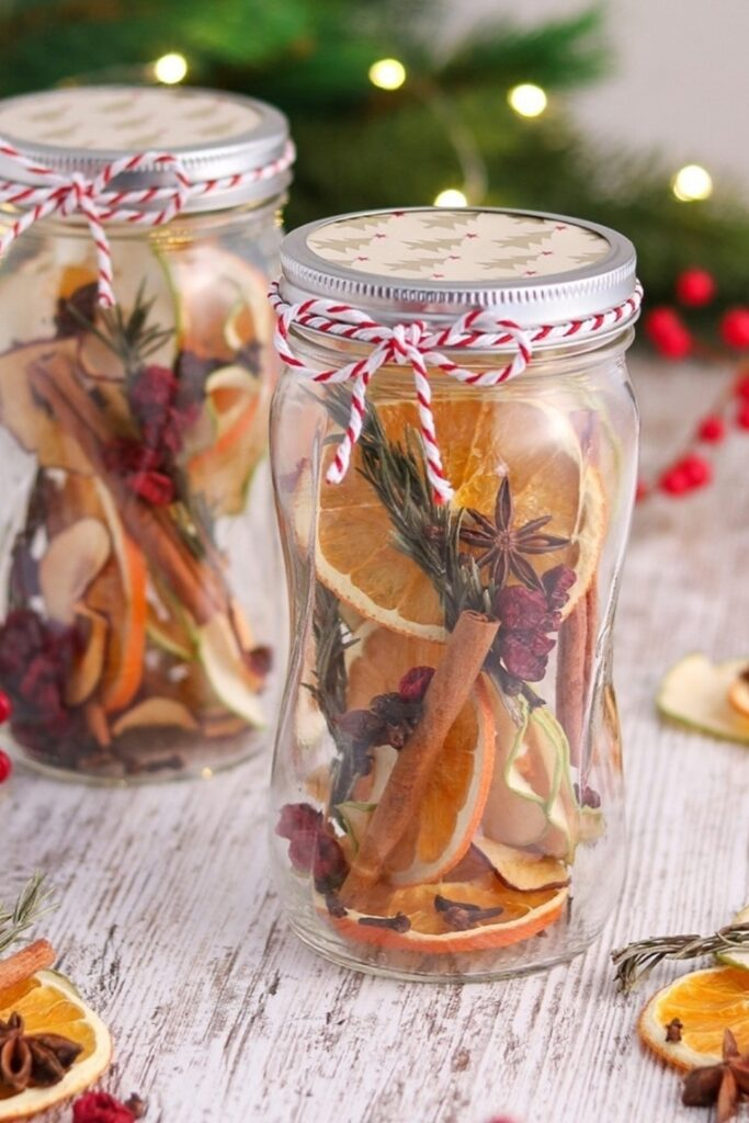 Fill jars with dried oranges, apple chips, cinnamon sticks, rosemary, and star anise.
