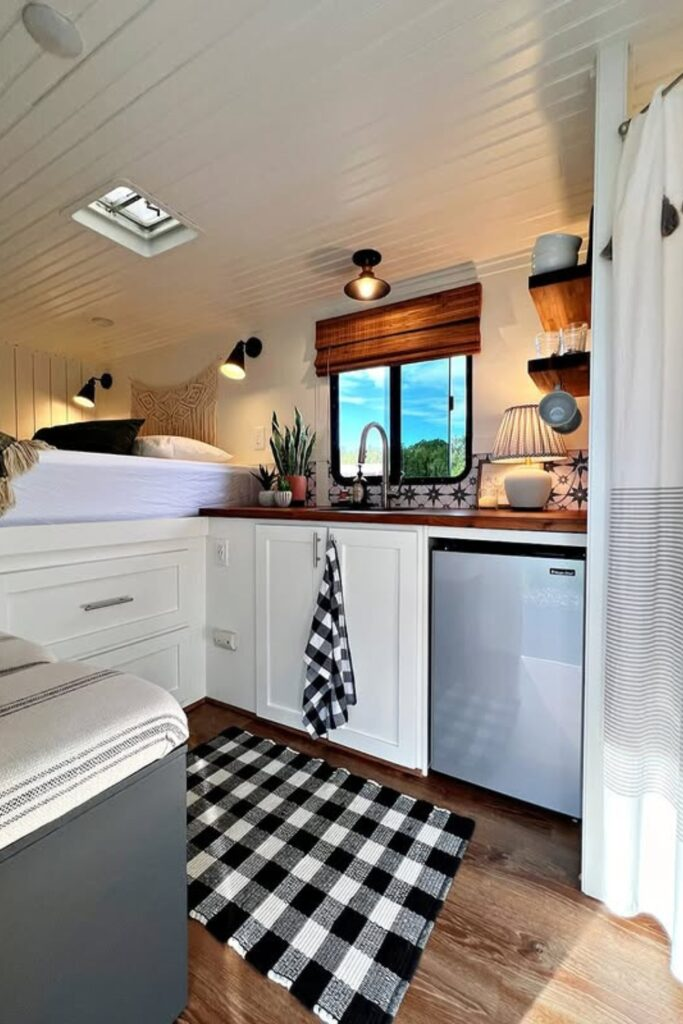 This design includes a raised bed, a small kitchen, and a compact fridge arranged neatly inside the trailer. White cabinets brighten the space, while wooden counters add warmth.