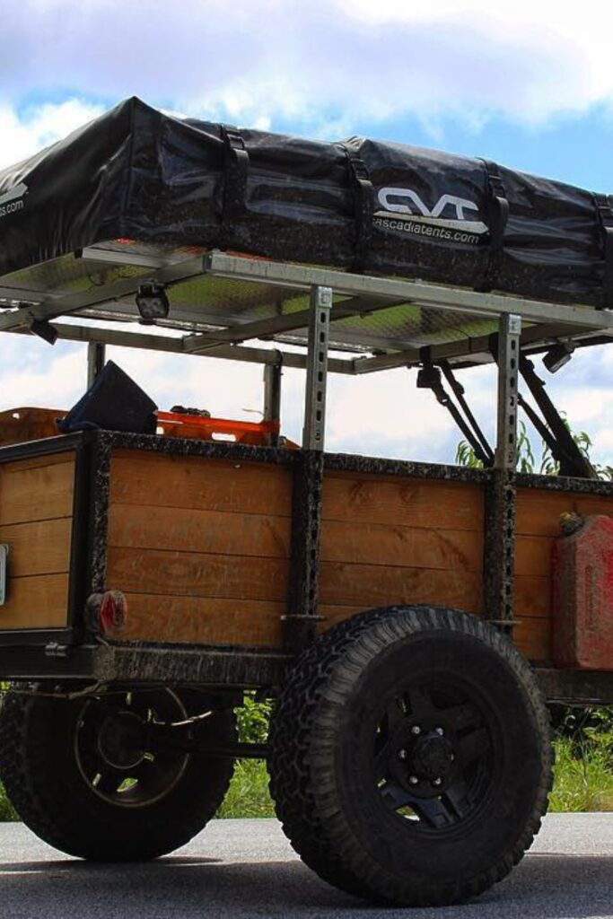 A micro trailer with storage on the bottom and a rooftop tent above gives you both organization and sleeping space. It keeps tools, water, and cooking gear neatly packed below.