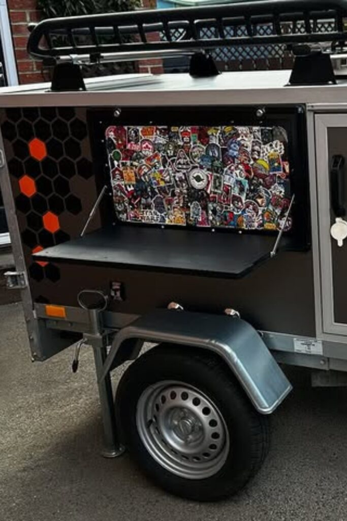 A wooden kitchen box that folds out from the side of your trailer can hold a stove, water jug, and prep counter. It keeps everything organized and easy to access while traveling.