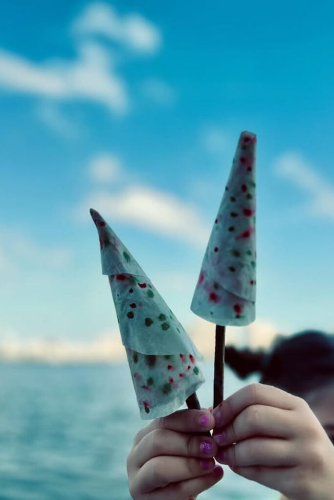 Begin by rolling the filters into cone shapes. Then stack these cones on top of one another. You can place them on sticks to act as the tree trunk.