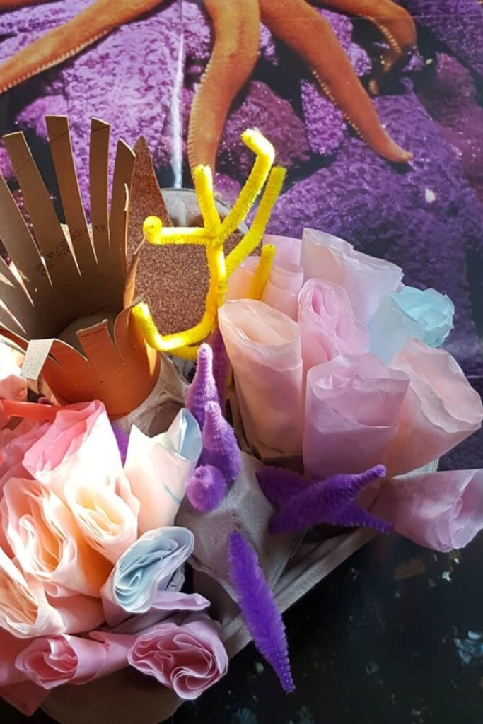 Use light colors like pink, blue, and peach to make the reef appear alive. You can add pipe cleaners to look like sea sponges and other branching corals.