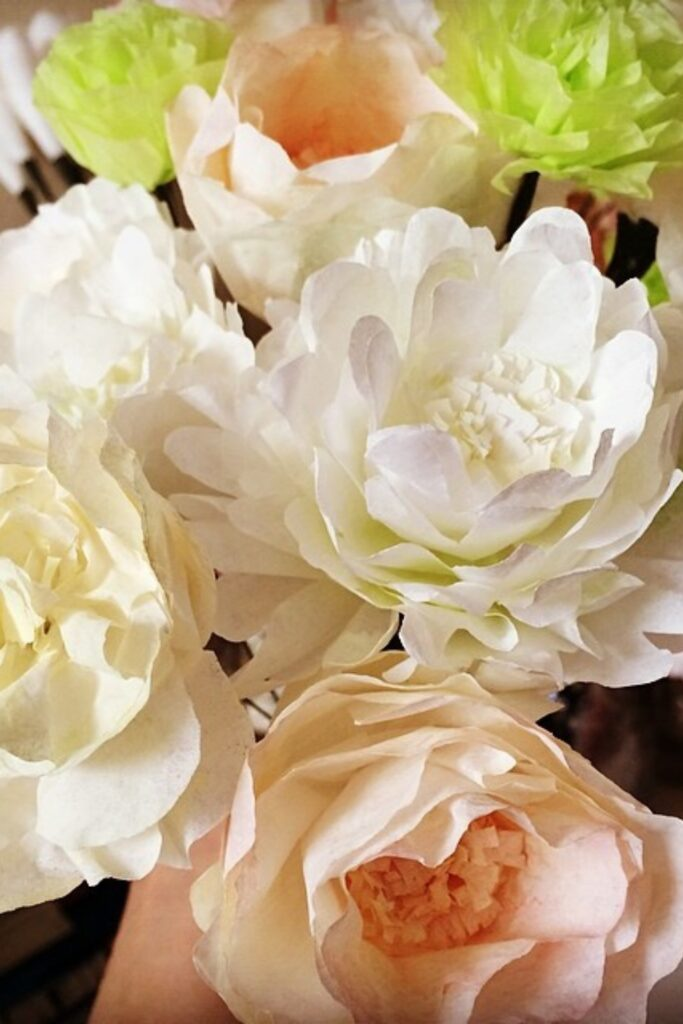 To make this, you cut the filters and roll them into shapes that look like petals. You then layer these shapes and glue them together to form full flowers.