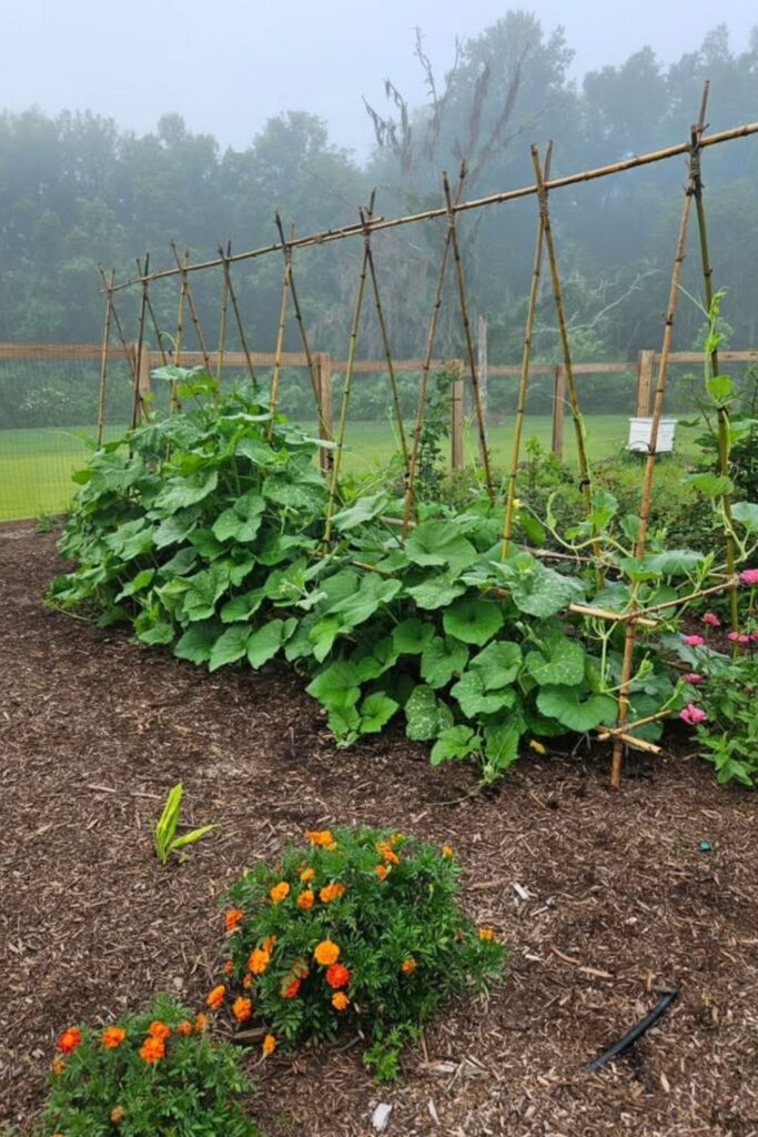 A bamboo row trellis uses poles arranged in a row, often tied together at the top. The vines climb up and spread evenly across the structure.