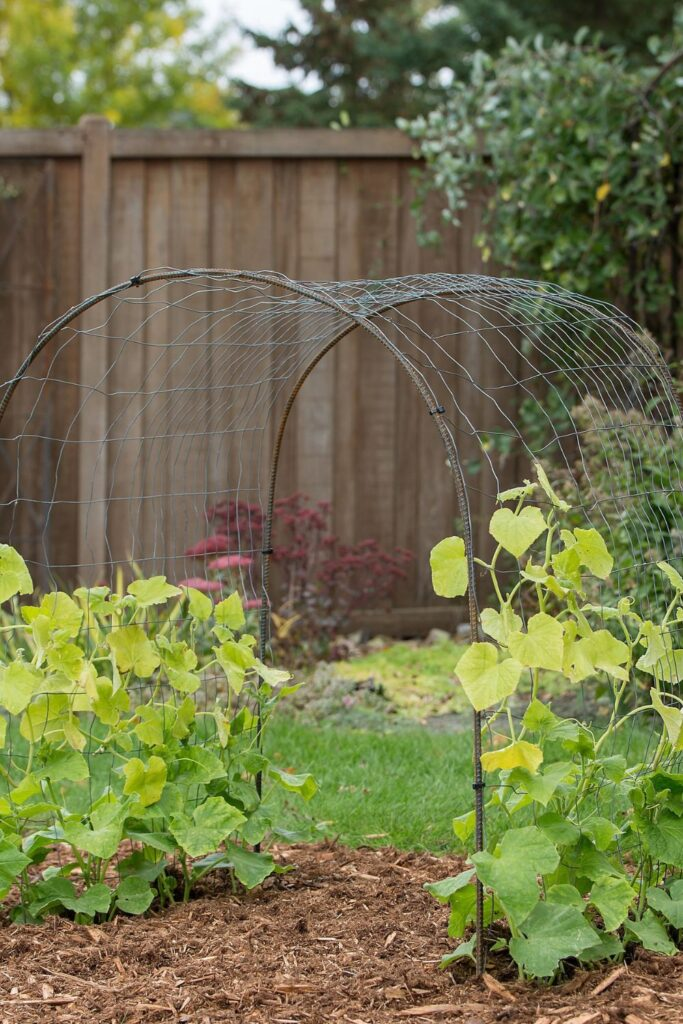 This trellis uses PVC pipes bent into a dome shape over cucumber plants. The vines grow upward and then across the top, forming a tunnel.