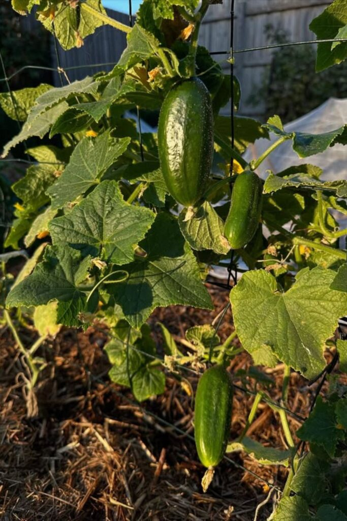 It improves airflow and encourages tall, clean growth. Cucumbers hang straight, making harvesting easier.