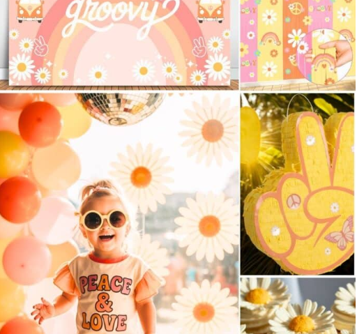 This retro-inspired theme brings relaxed vibes and cheerful colors together. Flowers, rainbows, and peaceful details set the tone.