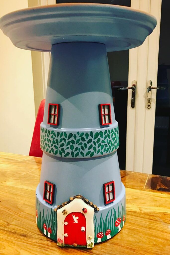 You can make a magical bird bath from terracotta pots. Stack a few pots on top of each other to make a tower. Paint them with soft colors and little designs like leaves or tiny windows.