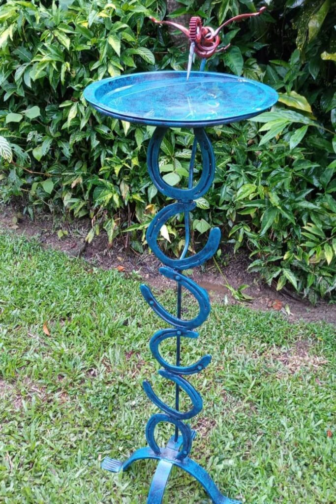 Make a unique bird bath using old horseshoes. Bend and connect the horseshoes into a spiral shape to form the base. Paint the spiral a shiny blue color to protect it and make it pretty.