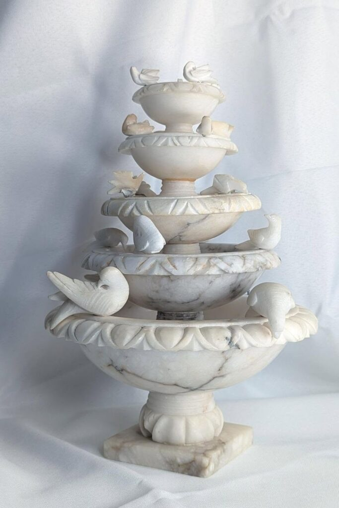 You can find bowls with carved bird shapes on the edges. The cool, smooth marble feels luxurious. This simple design adds a classic and sophisticated look to a patio or garden.