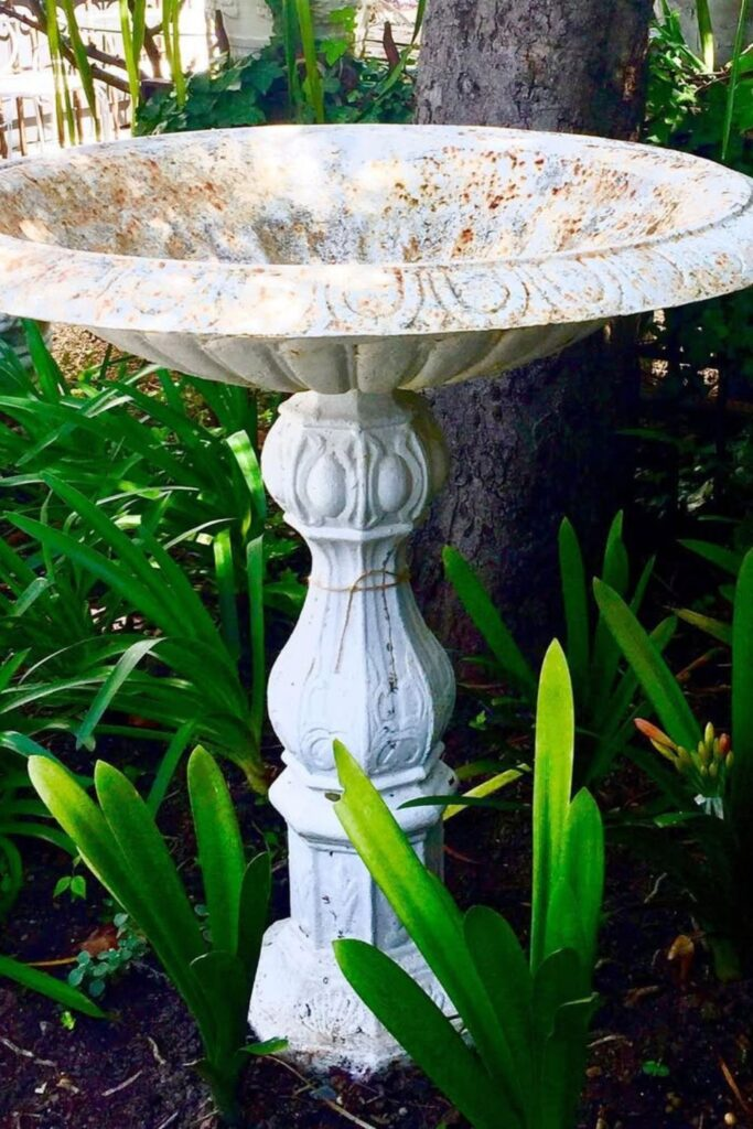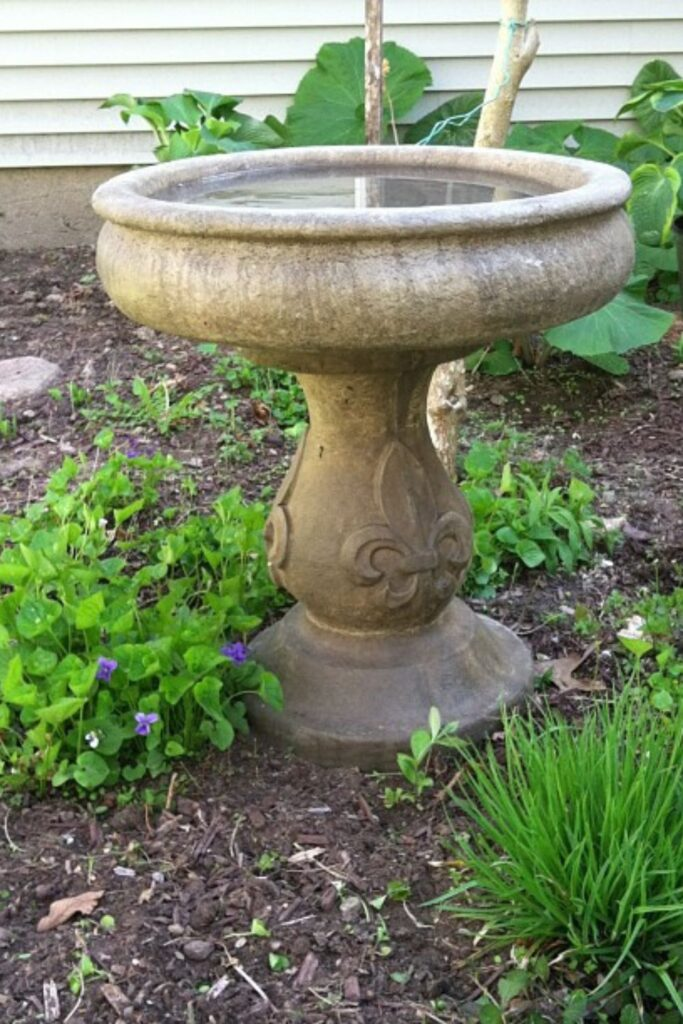 A simple concrete bird bath is very strong and lasts a long time. You can buy a plain one or make your own with a mold. Look for one with carved designs like flowers on the pedestal.