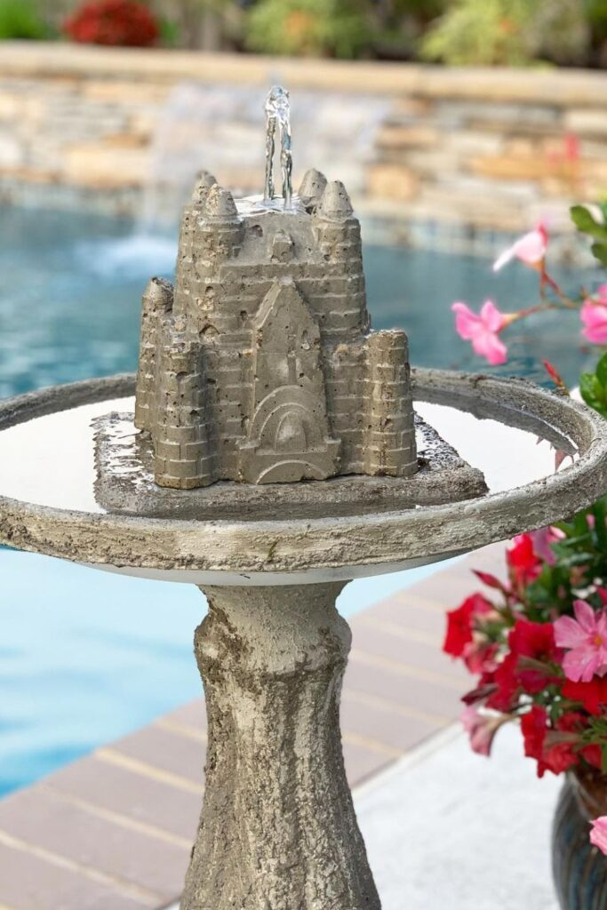 You can add a small water pump so water bubbles gently from the top of the castle. The old-looking stone creates a fairy-tale feeling. This fun design turns bird watching into a magical garden moment.